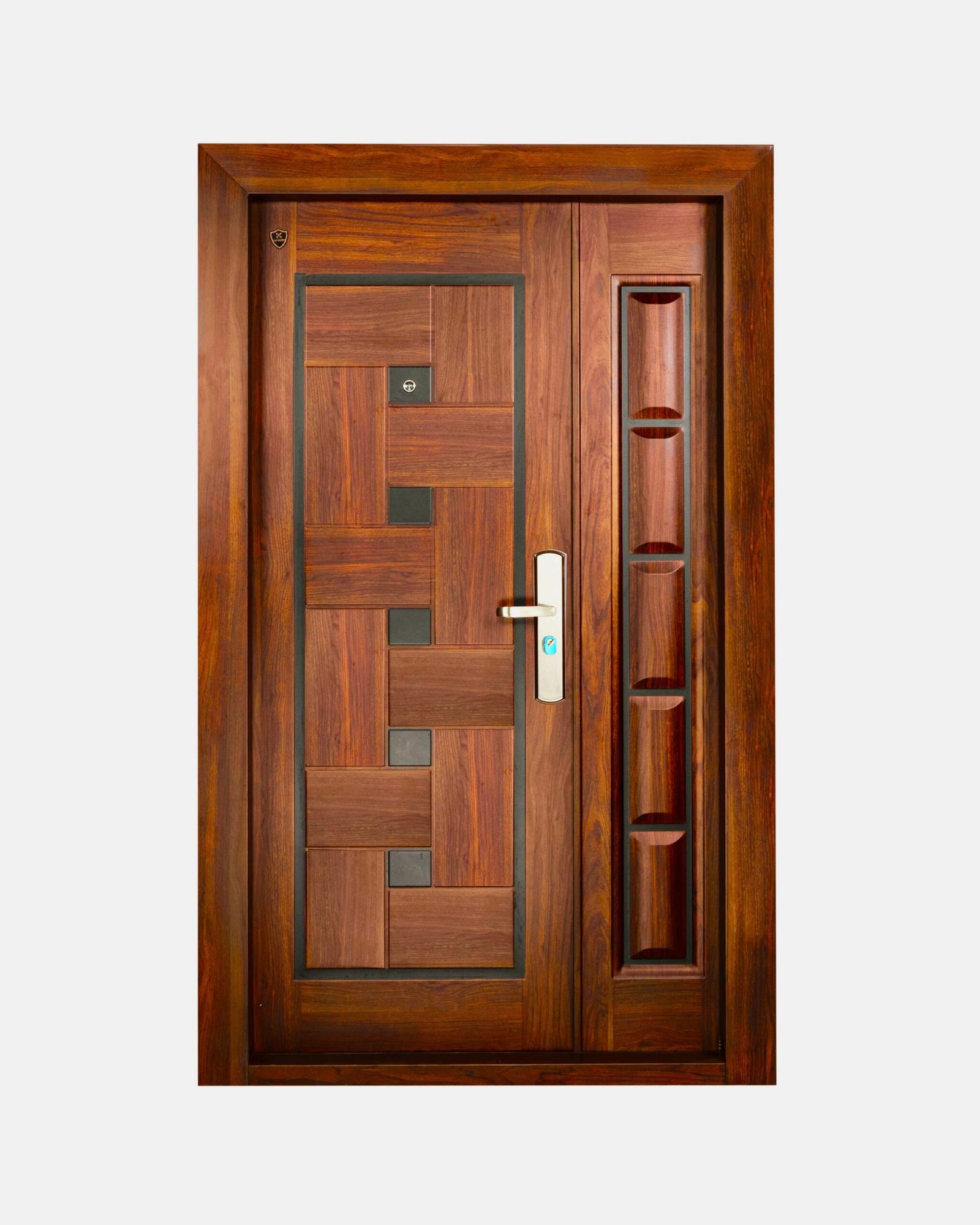 This model is perfect for those who prefer a bold yet balanced front door design with added detailing and reliable safety — making it a standout choice in both residential and premium housing projects.